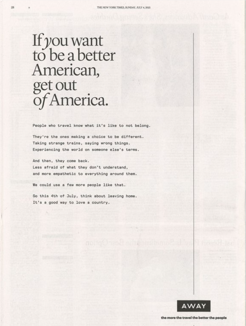Armed with a new brand belief (the more the travel, the better the people) we ran this bold and thought-provoking one page ad in the July 4 NY Times 2021 to remind people of the importance of travel.